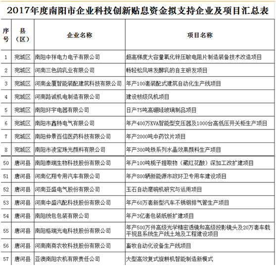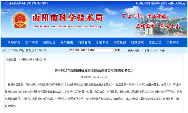 根據(jù)市工信委、市科技局、市財(cái)政局《關(guān)于申報(bào)2017年度南陽市企業(yè)科技創(chuàng)新貼息資金的通知》(宛工信聯(lián)〔2018〕114號)的相關(guān)要求,依照《2017年度南陽市財(cái)政支持企業(yè)科技創(chuàng)新貼息項(xiàng)目資金評審辦法》,2018年10月10日—12日,市工信委、市科技局、市財(cái)政局共同組織專家對企業(yè)申報(bào)材料進(jìn)行了評審,根據(jù)專家評審意見,經(jīng)研究,現(xiàn)將擬支持的71家企業(yè)共計(jì)71個項(xiàng)目予以公示。歡迎社會各界參與監(jiān)督,如有異議,請以電話或書面形式向市工信委、市科技局、市財(cái)政局反映。