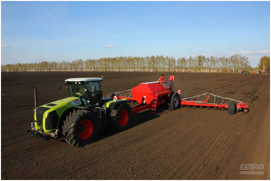 3、科樂收XERION系列剛剛上市的時候售價高達100萬美金。這款采用無級變速的拖拉機采用卡特彼勒 C13 6 缸發(fā)動機,最大功率可達 401–487 馬力,最高時速可達50公里/小時。