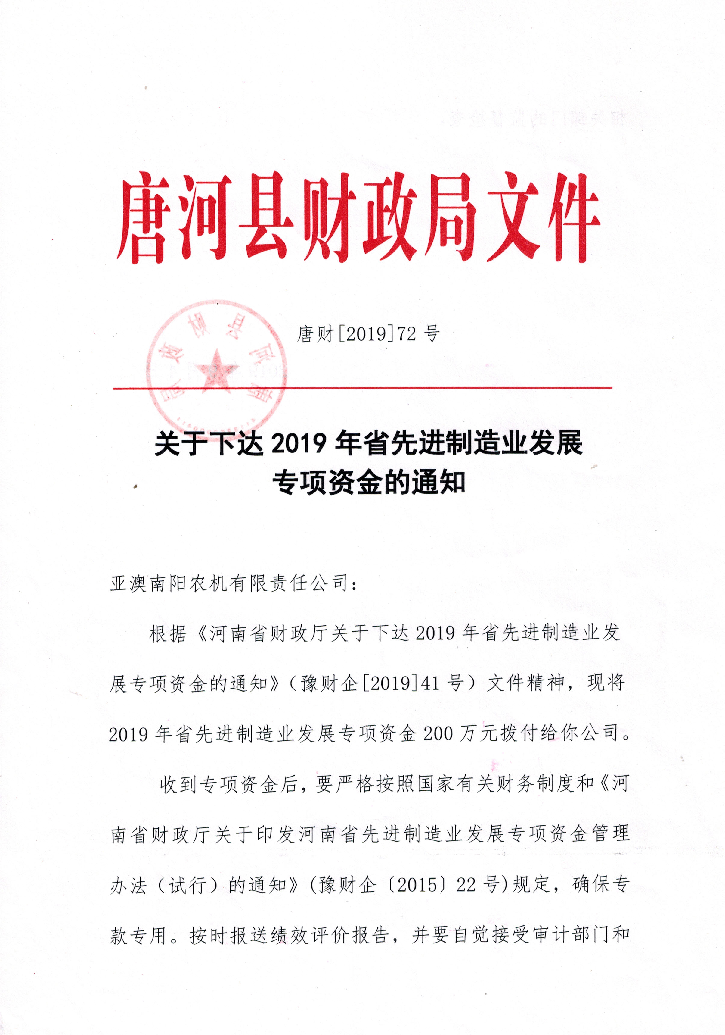 近日,國家工信部下達,河南省政府《印發(fā)<關(guān)于下達2019年省先進制造業(yè)發(fā)展專項獎金的通知》,對獲得先進制造業(yè)--國家綠色工廠的南陽市唐河縣亞澳南陽農(nóng)機有限責任公司的扶持專項資金200萬元下?lián)堋?/span>
