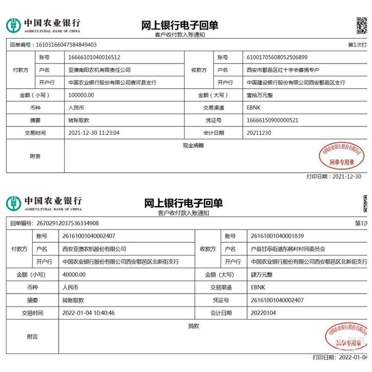 十二月份,一場(chǎng)突如其來的疫情打亂了西安人平靜的生活,面對(duì)日趨嚴(yán)峻的疫情態(tài)勢(shì),亞澳農(nóng)機(jī)作為一家有社會(huì)責(zé)任感的企業(yè)積極奉獻(xiàn)自己力量,亞澳農(nóng)機(jī)南陽公司為鄠邑區(qū)紅十字會(huì)捐款100000元,亞澳農(nóng)機(jī)總公司為鄠邑區(qū)甘亭街道東韓村捐款40000元,亞澳農(nóng)機(jī)與社會(huì)各界人士并肩作戰(zhàn),為疫情防控工作貢獻(xiàn)自己的一份薄力。